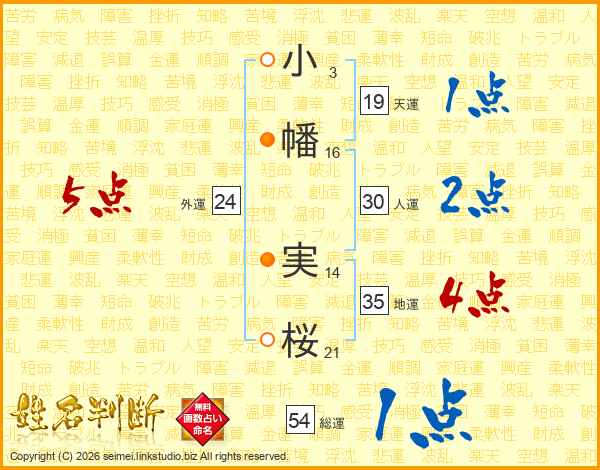 小(3画)幡(16画) 実(14画)桜(21画)
