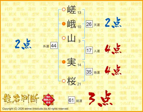 嵯(13画)峨(10画)山(3画) 実(14画)桜(21画)