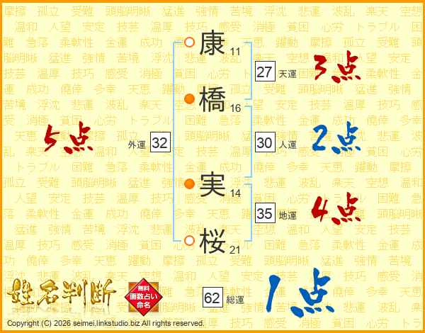 康(11画)橋(16画) 実(14画)桜(21画)