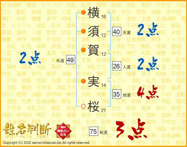 横(16画)須(12画)賀(12画) 実(14画)桜(21画)