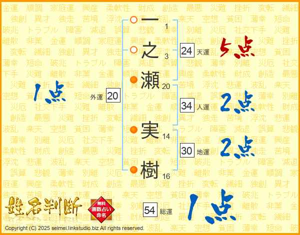 一(1画)之(3画)瀬(20画) 実(14画)樹(16画)