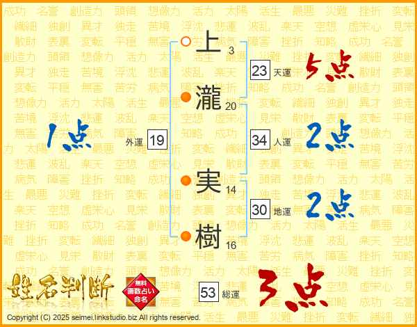 上(3画)瀧(20画) 実(14画)樹(16画)