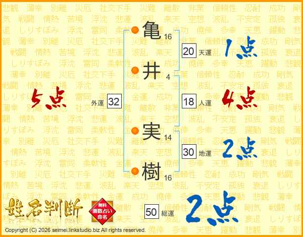あなたの人生を表す1番重要な運勢です。生涯を通じて影響する総合運となり、主に50歳以降の晩年期に影響を及ぼします。苗字と名前の合計画数。