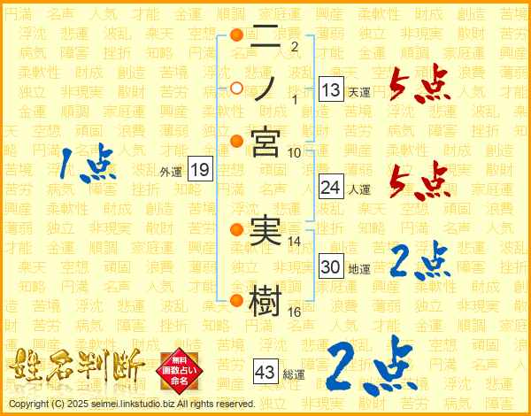 二(2画)ノ(1画)宮(10画) 実(14画)樹(16画)