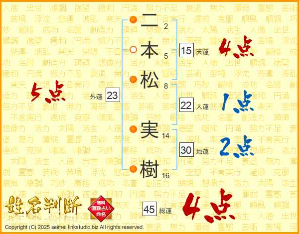 二(2画)本(5画)松(8画) 実(14画)樹(16画)