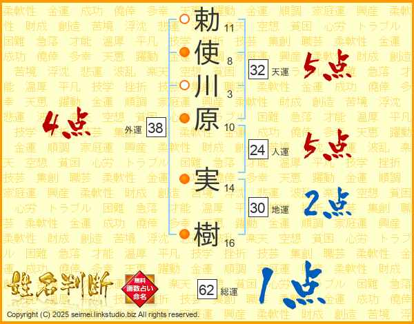 勅(11画)使(8画)川(3画)原(10画) 実(14画)樹(16画)