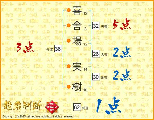 喜(12画)舎(8画)場(12画) 実(14画)樹(16画)
