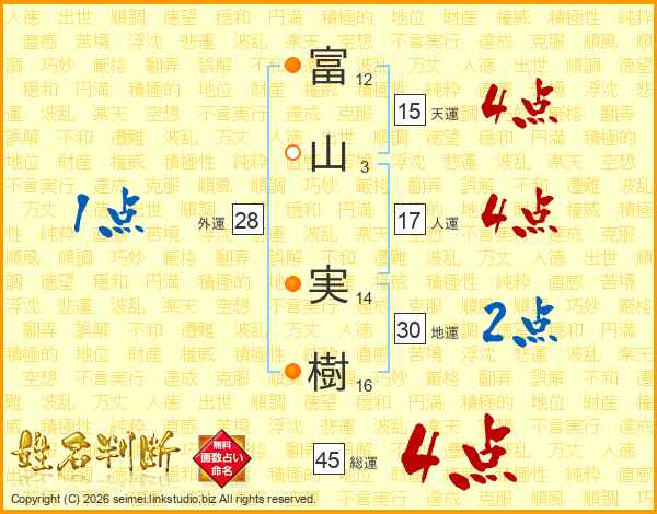 富(12画)山(3画) 実(14画)樹(16画)