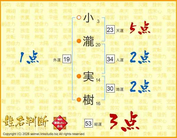 小(3画)瀧(20画) 実(14画)樹(16画)