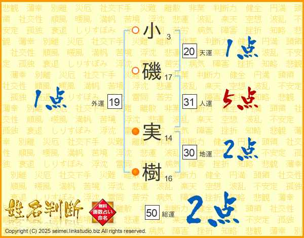 生活面を象徴する運勢です。外部から受ける影響力を表し、結婚運、家庭運や職場、環境への順応性を表します。総運から人運を引いた画数。姓や名が1文字の場合を除く。
