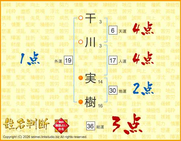 干(3画)川(3画) 実(14画)樹(16画)