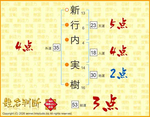 新(13画)行(6画)内(4画) 実(14画)樹(16画)