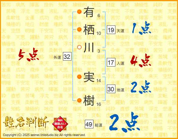 有(6画)栖(10画)川(3画) 実(14画)樹(16画)