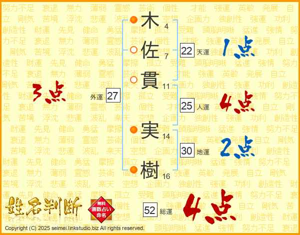 木(4画)佐(7画)貫(11画) 実(14画)樹(16画)