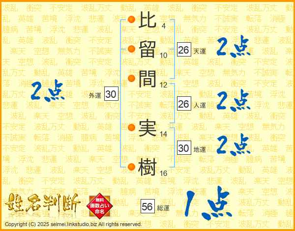 比(4画)留(10画)間(12画) 実(14画)樹(16画)