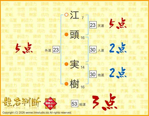 家系が持つ宿命的な運勢を表します。祖先から受け継いだ苗字ですので自分の力が及びません。家柄を象徴します。苗字の合計画数。