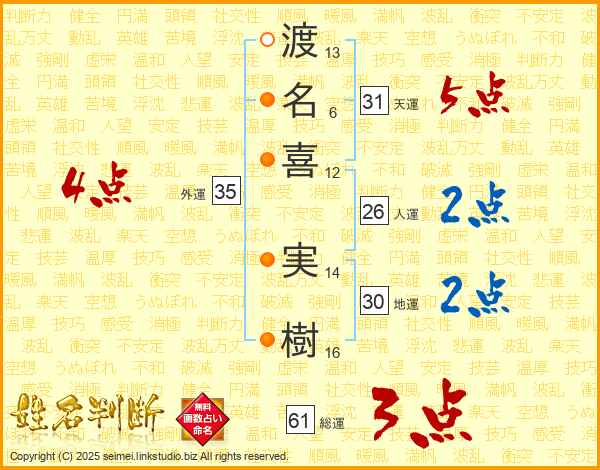 渡(13画)名(6画)喜(12画) 実(14画)樹(16画)