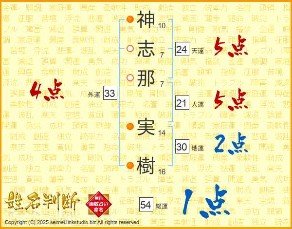 神(10画)志(7画)那(7画) 実(14画)樹(16画)