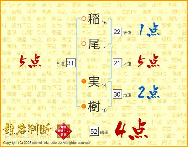 稲(15画)尾(7画) 実(14画)樹(16画)