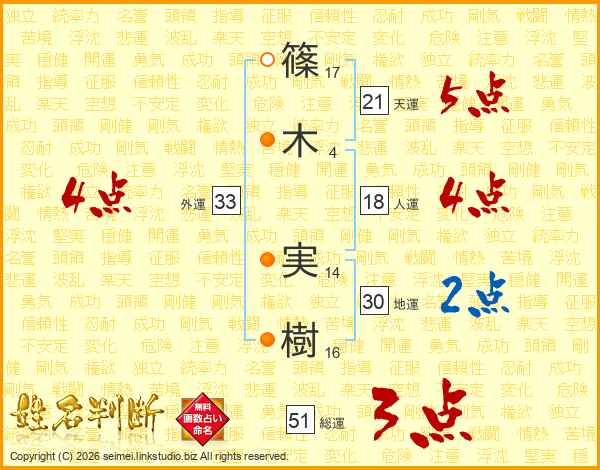 篠(17画)木(4画) 実(14画)樹(16画)