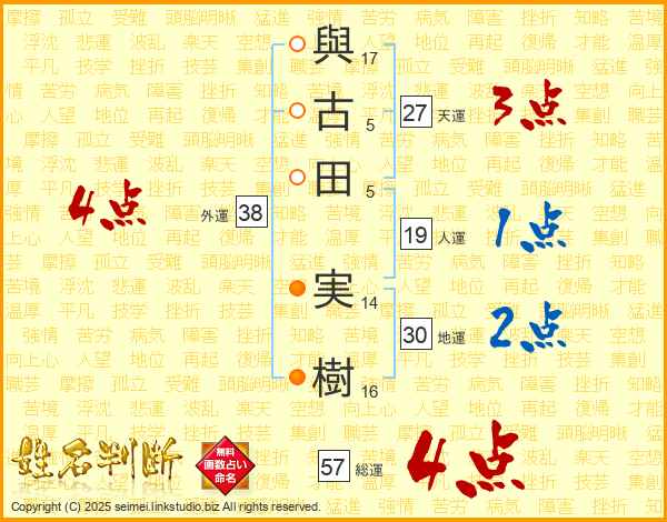 與(17画)古(5画)田(5画) 実(14画)樹(16画)