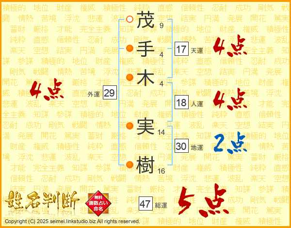 茂(9画)手(4画)木(4画) 実(14画)樹(16画)