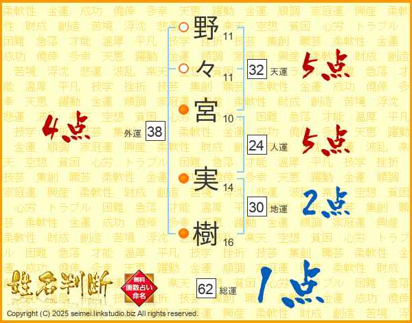 野(11画)々(11画)宮(10画) 実(14画)樹(16画)