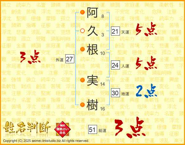 阿(8画)久(3画)根(10画) 実(14画)樹(16画)
