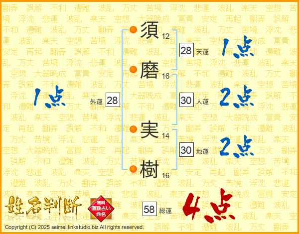 あなたの人生を表す1番重要な運勢です。生涯を通じて影響する総合運となり、主に50歳以降の晩年期に影響を及ぼします。苗字と名前の合計画数。