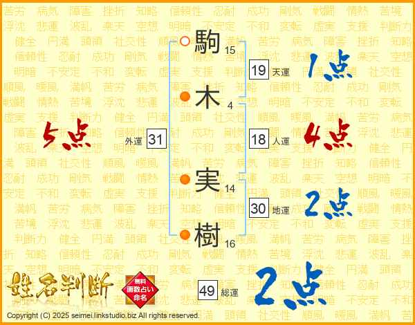 あなたの人生を表す1番重要な運勢です。生涯を通じて影響する総合運となり、主に50歳以降の晩年期に影響を及ぼします。苗字と名前の合計画数。