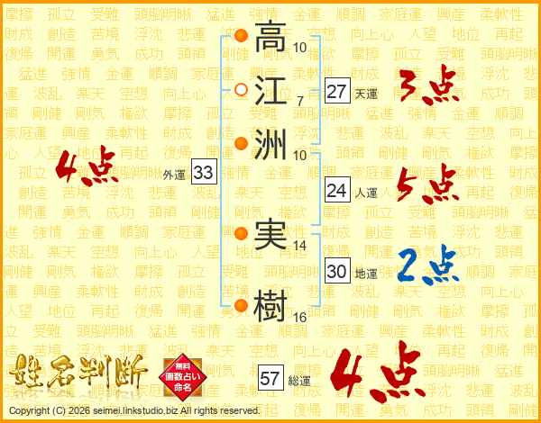 高(10画)江(7画)洲(10画) 実(14画)樹(16画)