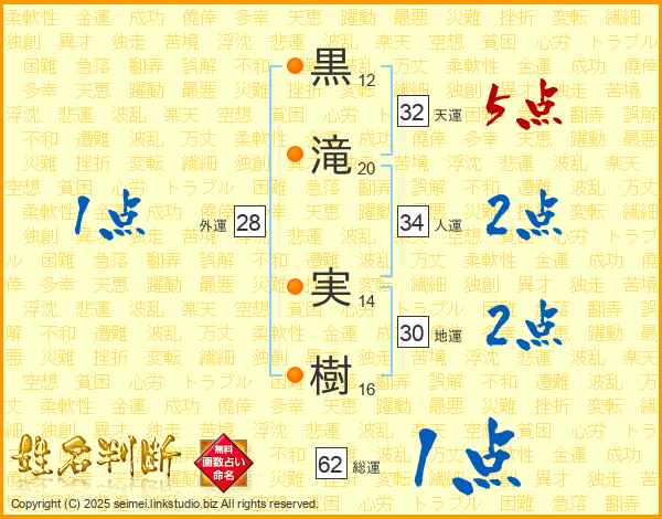 黒(12画)滝(20画) 実(14画)樹(16画)