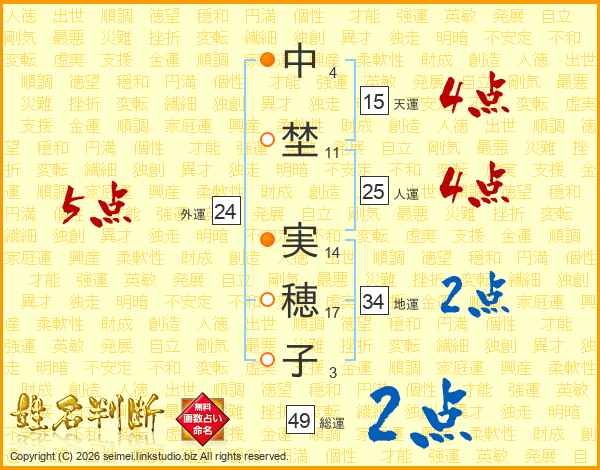 中(4画)埜(11画) 実(14画)穂(17画)子(3画)