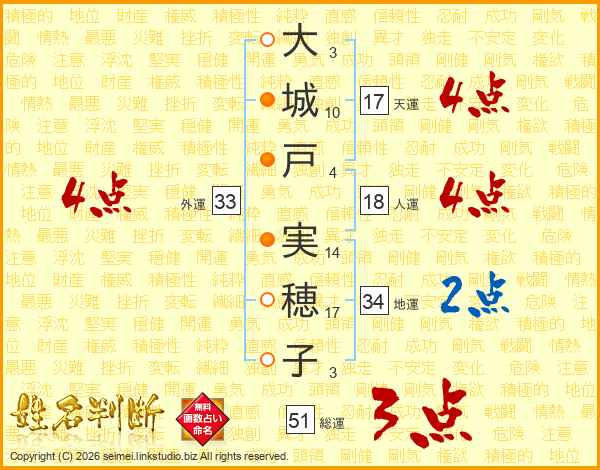 大(3画)城(10画)戸(4画) 実(14画)穂(17画)子(3画)