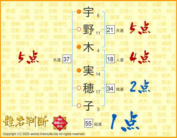 宇野木実穂子さんの天運は21画の5点!