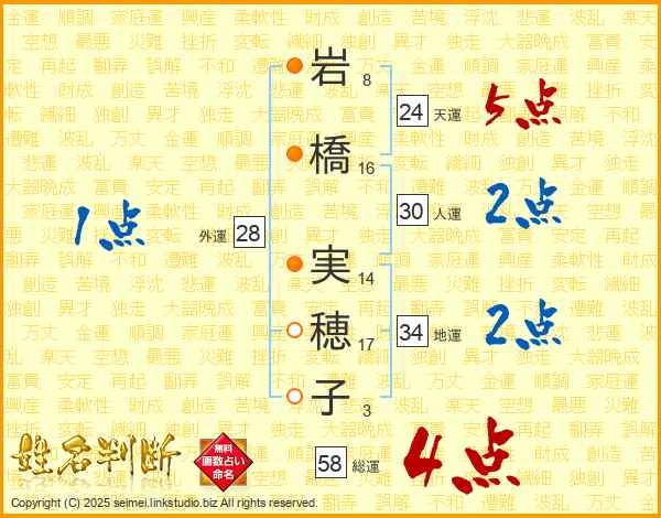 岩(8画)橋(16画) 実(14画)穂(17画)子(3画)