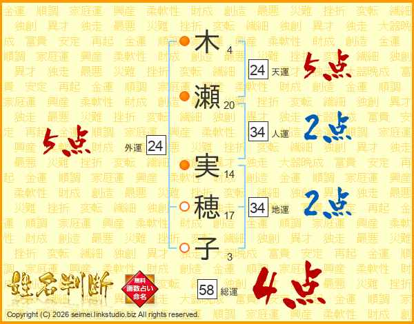 木(4画)瀬(20画) 実(14画)穂(17画)子(3画)