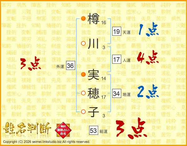 樽(16画)川(3画) 実(14画)穂(17画)子(3画)