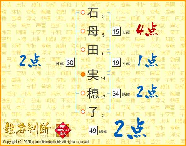 石(5画)母(5画)田(5画) 実(14画)穂(17画)子(3画)