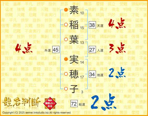 素(10画)稲(15画)葉(13画) 実(14画)穂(17画)子(3画)