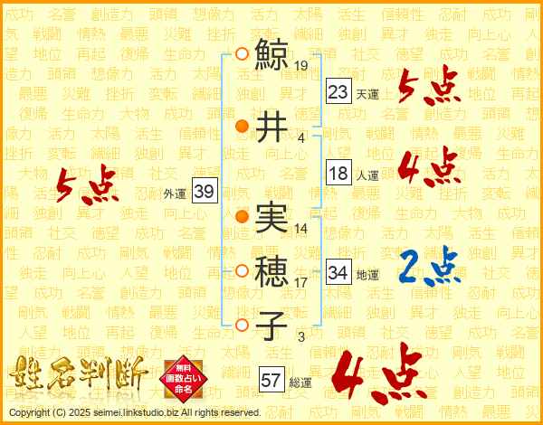 鯨(19画)井(4画) 実(14画)穂(17画)子(3画)