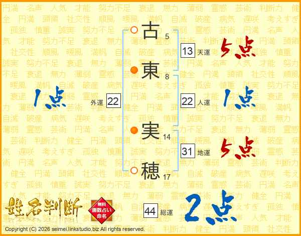 画数の奇数(○陽)と偶数(●陰)の配列で吉凶を占います。どちらかにかたよる名前は大凶名で避ける必要があります。画数の奇数偶数。
