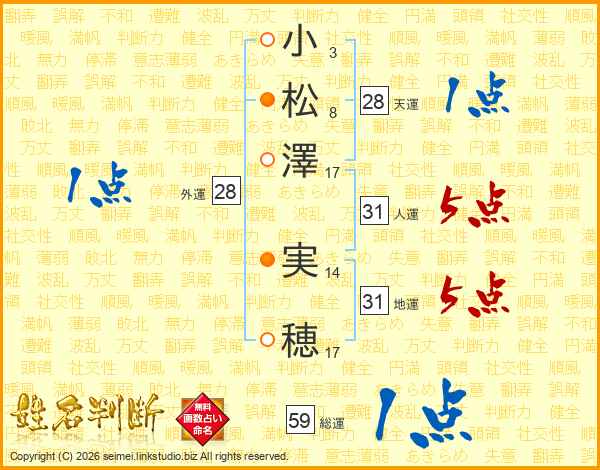 小(3画)松(8画)澤(17画) 実(14画)穂(17画)
