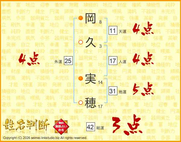 岡(8画)久(3画) 実(14画)穂(17画)