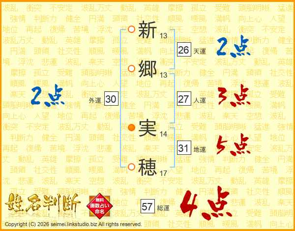 生活面を象徴する運勢です。外部から受ける影響力を表し、結婚運、家庭運や職場、環境への順応性を表します。総運から人運を引いた画数。姓や名が1文字の場合を除く。