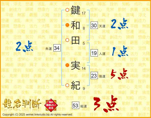 鍵(17画)和(8画)田(5画) 実(14画)紀(9画)