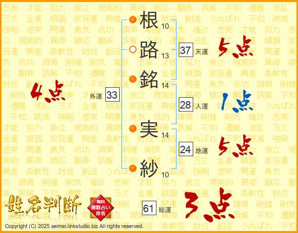 根(10画)路(13画)銘(14画) 実(14画)紗(10画)