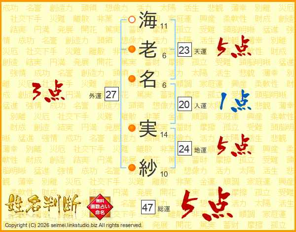 海(11画)老(6画)名(6画) 実(14画)紗(10画)