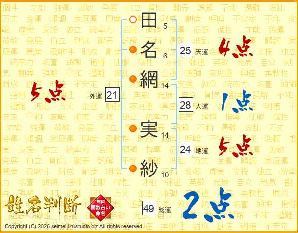 田(5画)名(6画)網(14画) 実(14画)紗(10画)