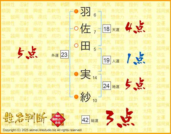 羽(6画)佐(7画)田(5画) 実(14画)紗(10画)